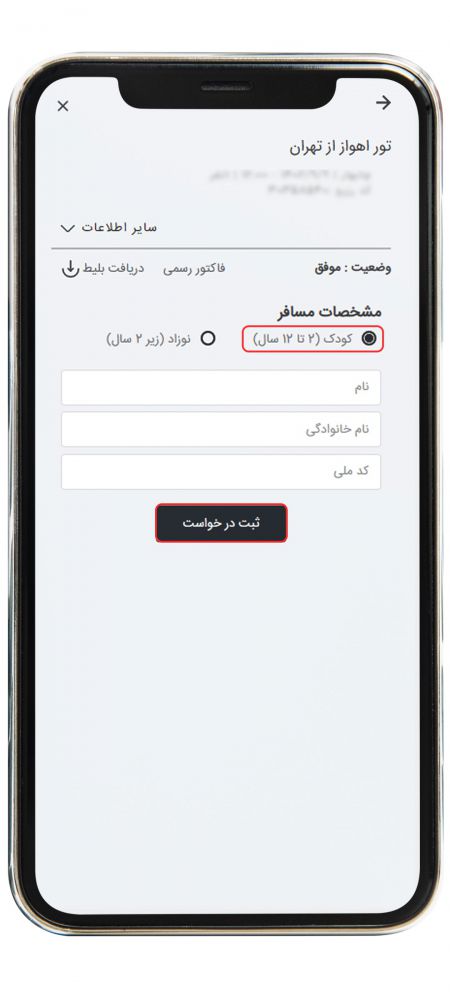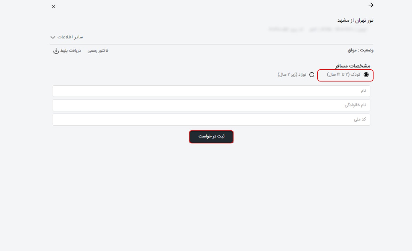 پس از انتخاب گزینه "کودک / نوزاد" وارد صفحه جدیدی می شوید. در این صفحه با توجه به سن مسافر گزینه کودک (2 تا 12 سال) یا نوزاد (زیر 2 سال) را انتخاب کنید. سپس نام، نام خانوادگی و کد ملی مسافر را وارد کرده و گزینه "ثبت درخواست" را انتخاب کنید.