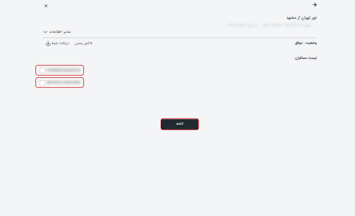 سپس مسافر یا مسافرین را انتخاب کرده و روی گزینه "ادامه" کلیک کنید.
