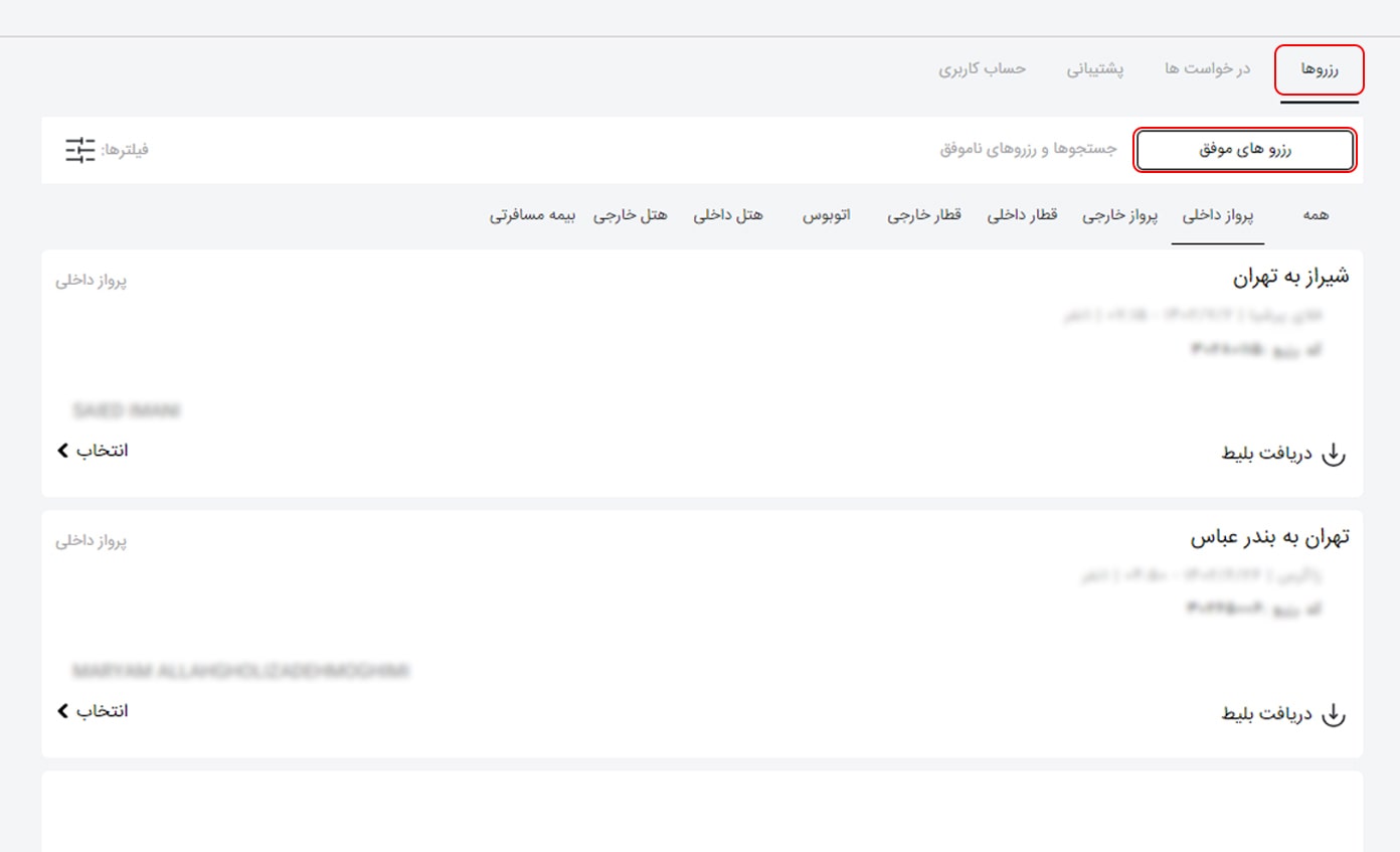 در این بخش می توانید تمام خریدهای انجام شده را مشاهده کنید اما توصیه می شود روی گزینه "پروازهای داخلی" کلیک کنید تا بلیط مد نظر خود را سریع تر پیدا کنید.