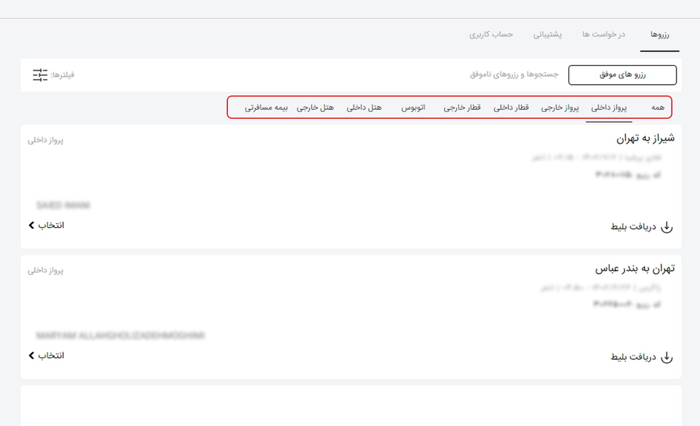 برای دسترسی سریع تر به بلیط مد نظر می توانید از فیلترها کمک بگیرید. در سمت چپ و بالای لیست بلیط ها، گزینه فیلتر قابل مشاهده است. روی آن کلیک کرده و در صفحه باز شده یکی از اطلاعات خواسته شده شامل کد رزرو، مبدا، مقصد، تاریخ رفت یا برگشت را وارد کنید و روی "فیلتر" کلیک نمایید.
