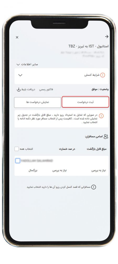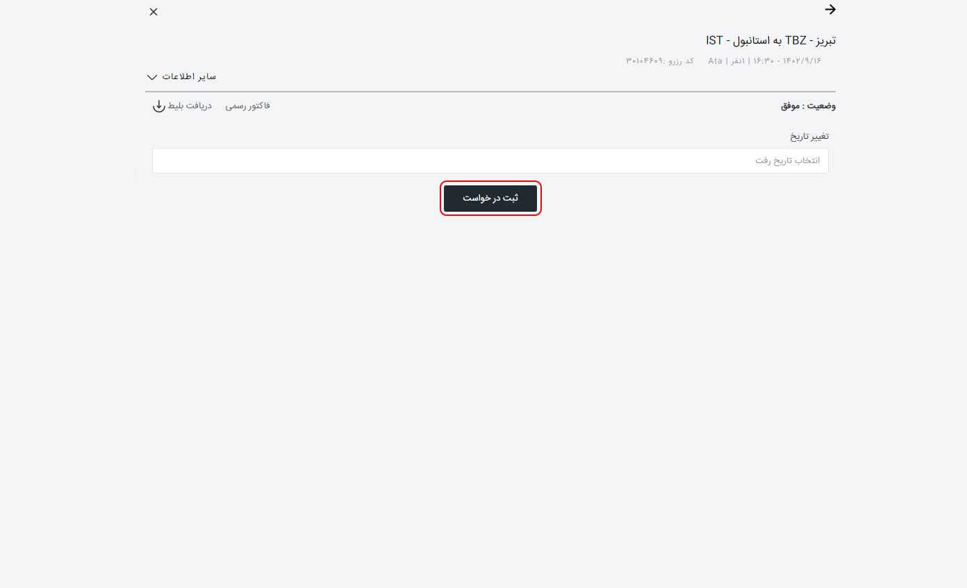 در این صفحه اطلاعات و جزئیات کامل بلیط قابل مشاهده است. روی گزینه "ثبت درخواست" کلیک کرده تا وارد صفحه مربوطه شوید.