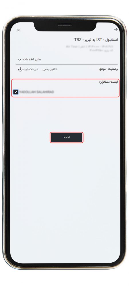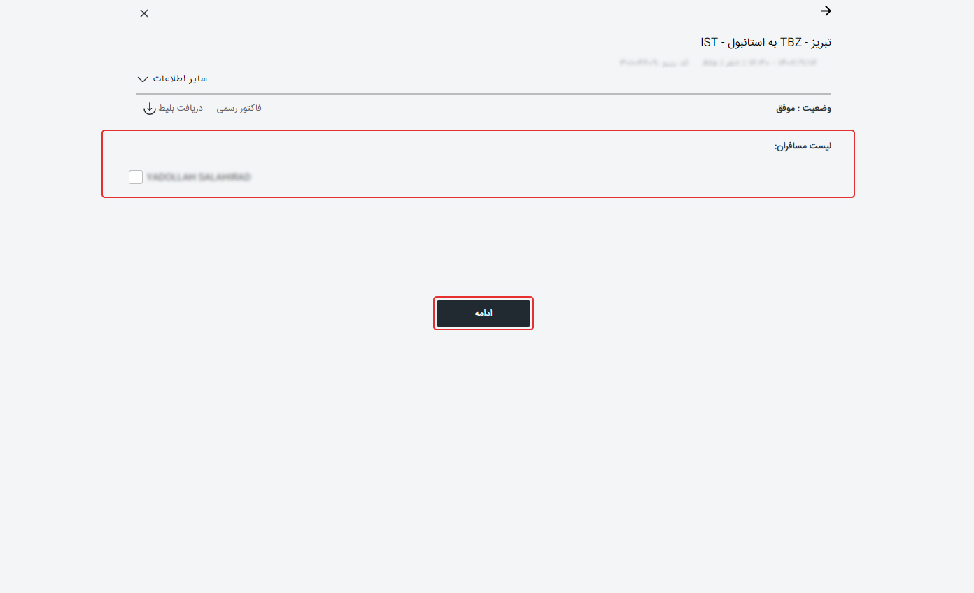 سپس مسافر یا مسافرین مد نظر را انتخاب کنید و روی گزینه "ادامه" کلیک کنید.