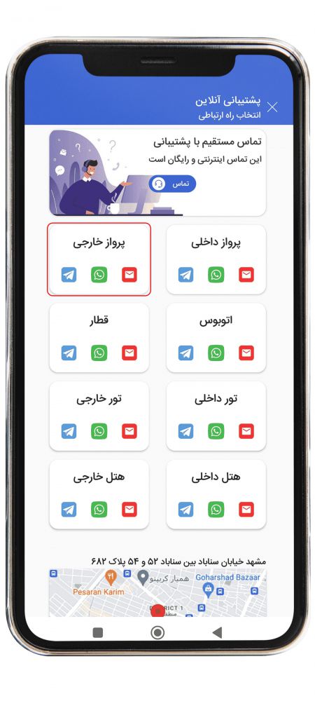 در این صفحه می توانید راه های مختلف تماس با مرکز پشتیبانی را مشاهده کنید. برای دسترسی مستقیم به پشتیبان های مربوط به تغییر تاریخ پرواز خارجی، در کادر مربوطه (پرواز خارجی) روی یکی از گزینه های ایمیل، واتسپ یا تلگرام کلیک نمایید.