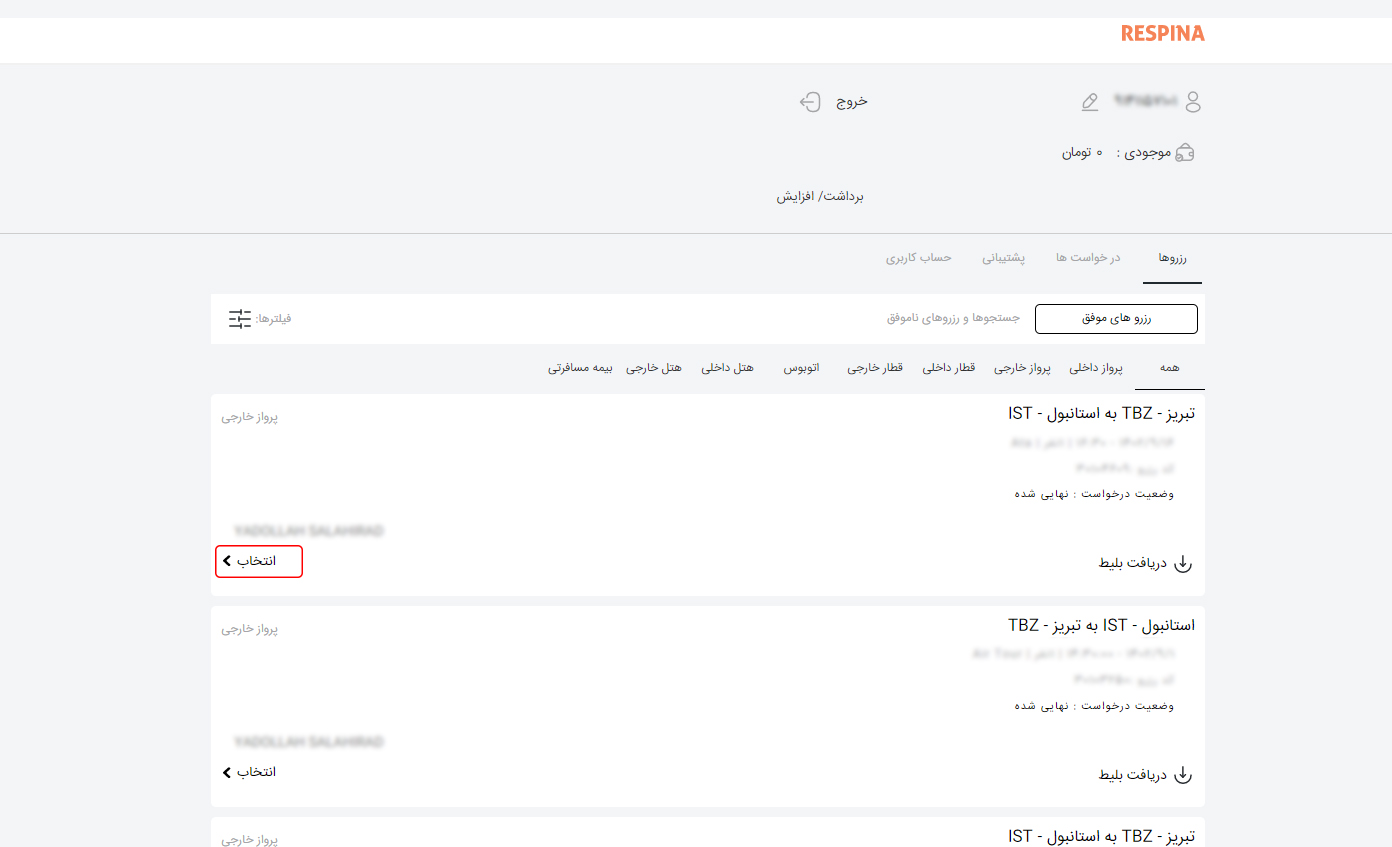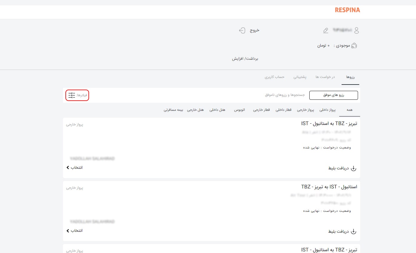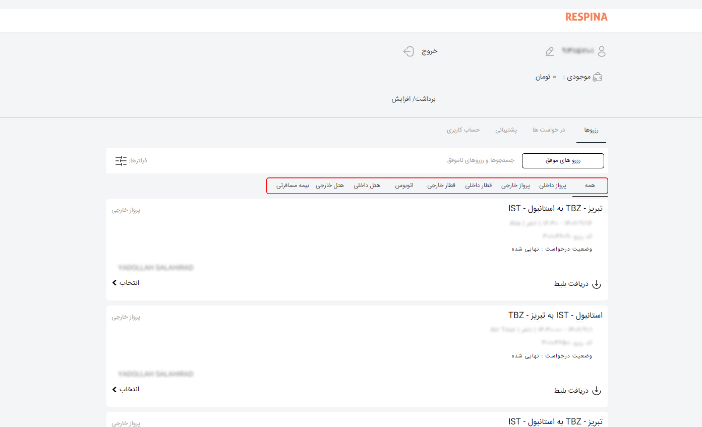 برای ثبت ثبت درخواست تغییر تاریخ پرواز خارجی باید وارد وبسایت رسپینا و سپس حساب کاربری خود شوید. اگر با نحوه ایجاد حساب کاربری آشنایی ندارید، راهنمای مربوط به ثبت نام در سایت را مطالعه کنید. پس از ورود به حساب کاربری پنل شما به شکل زیر نمایش داده می شود. پس از ورود به حساب کاربری به قسمت "رزرو ها" و سپس "رزرو های موفق" بروید.