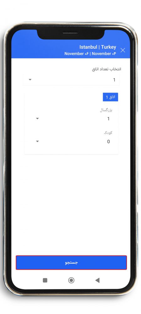 در صفحه جدید تعداد اتاق و تعداد مسافران را بر حسب بزرگسال و کودک ( 0 تا 3 سال) وارد کرده و روی گزینه جستجو کلیک کنید.