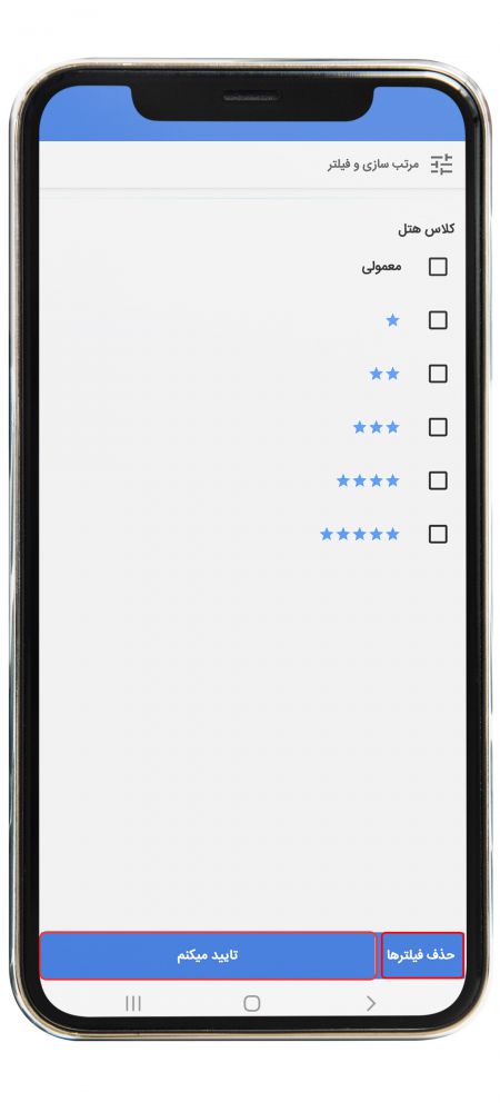 پس از کلیک بر گزینه "مرتب سازی و فیلتر" وارد صفحه زیر می شوید. می توانید کلاس هتل مد نظر خود را فعال کنید و با انتخاب عبارت "تایید می کنم" نمایش هتل ها را تغییر دهید. چنانچه تمایلی برای استفاده از فیلترها ندارید، گزینه "حذف فیلترها" را انتخاب کنید.