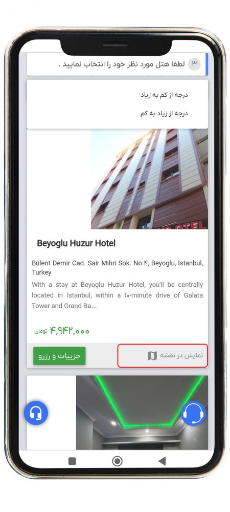 همچنین می توانید با انتخاب گزینه نمایش در نقشه، موقعیت مکانی و فاصله هتل تا اماکن مهم را بررسی کنید.