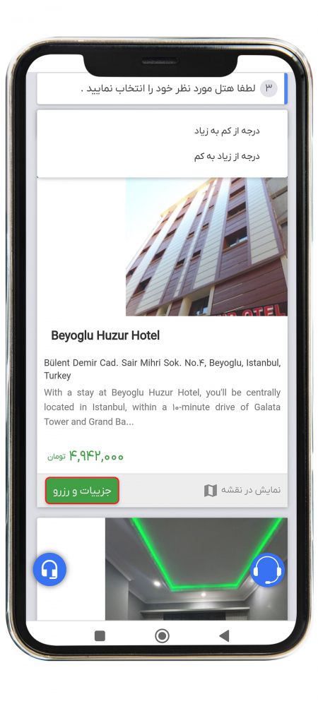 پس از بررسی و مقایسه هتل ها، روی گزینه "جزئیات و رزرو" کلیک کنید. همچنین می توانید با انتخاب "گزینه نمایش در نقشه"، موقعیت مکانی و فاصله هتل تا اماکن مهم را بررسی کنید.