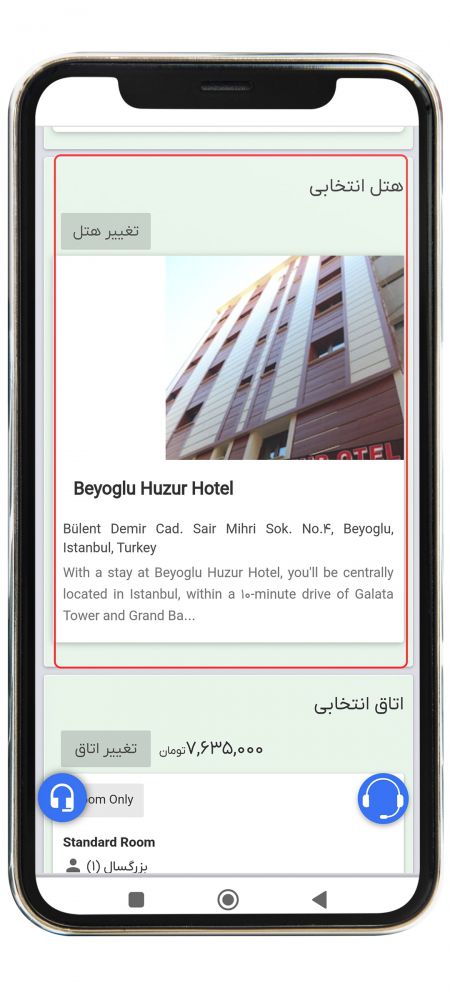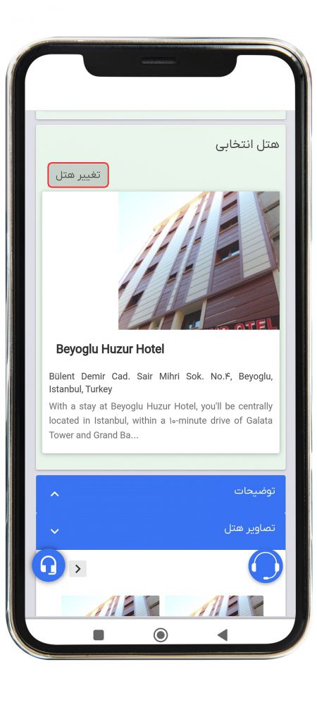 پس از انتخاب هتل، اگر تمایل به تغییر هتل خود داشته باشید، می توانید با انتخاب گزینه "تغییر هتل" به مراحل قبلی باز خواهید گشت.