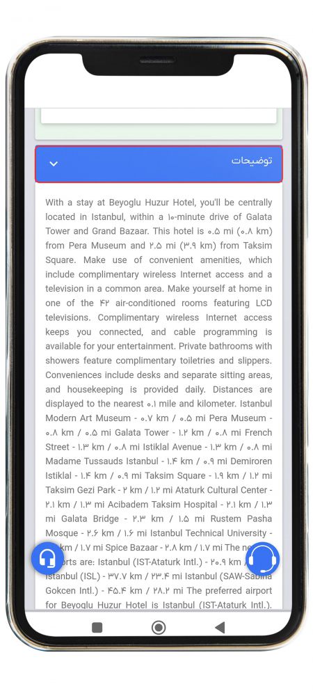 در صفحه باز شده، تمامی امکانات و جزئیات مربوط به هتل نوشته شده است، پس از بررسی این موارد با انتخاب آیکون ضربدری شکل در بالای صفحه مجدد به لیست هتل ها هدایت می شوید.