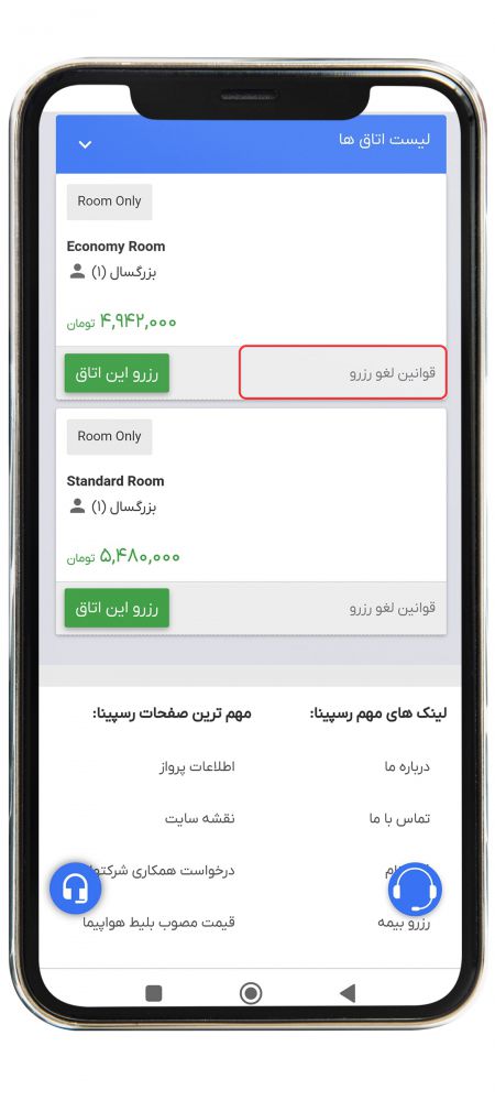 پس از کلیک بر روی گزینه قوانین، سیاست های لغو رزرو اتاق به همراه جریمه کنسلی مانند تصویر زیر نمایش داده می شود.