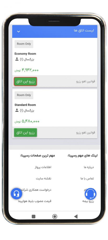پس از بررسی و مقایسه اتاق ها، روی گزینه "انتخاب" در کادر مربوط به هر اتاق و سپس بر گزینه "انتخاب اتاق ها" کلیک کنید.