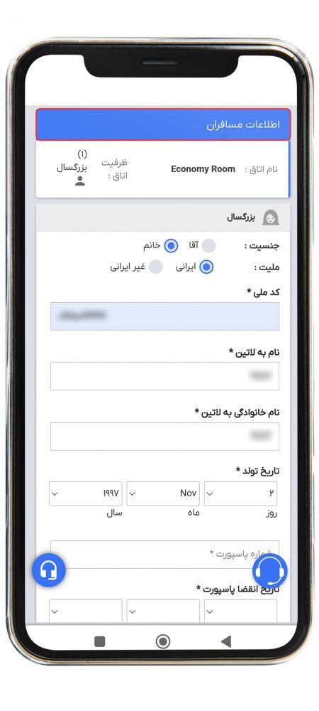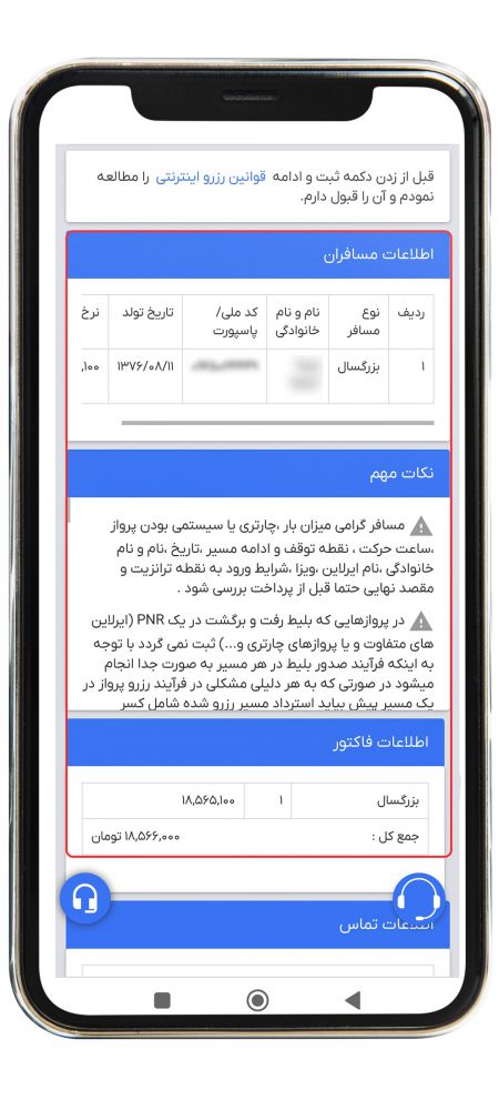 در پایین صفحه نیز با توجه به تعداد مسافرین، کادر مخصوص درج اطلاعات، وجود دارد. در کادر مربوط به هر مسافر اطلاعات کامل مسافر را بر اساس اطلاعات موجود در کارت شناسایی به طور دقیق و بدون اشتباه تایپی تکمیل نمایید. حتما نکات مهم را پیش از رزرو نهایی مطالعه کنید.