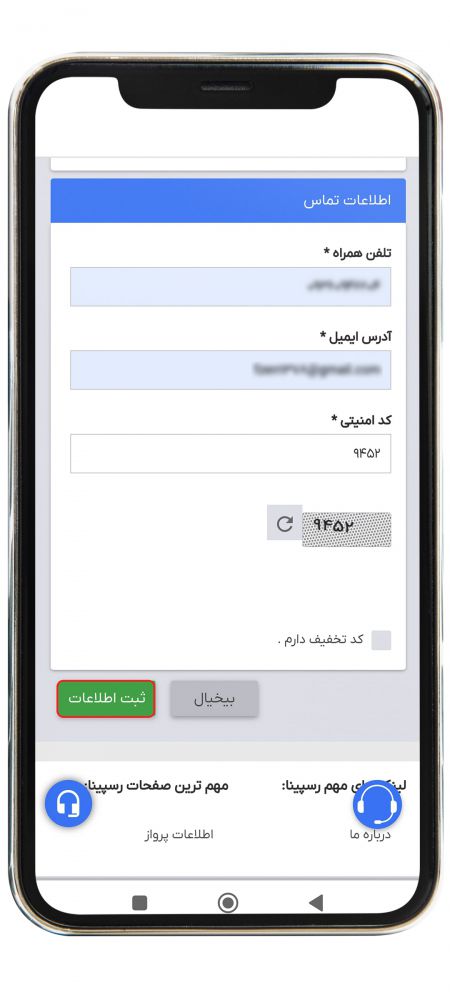 پس از وارد کردن اطلاعات مسافرین، در کادر پایین باید اطلاعات تماس خود را وارد کنید. همچنین اگر کد تخفیف دارید، این گزینه را فعال کنید و کد خود را وارد کنید. در صورتی که کد شما اعتبار داشته باشد، در هزینه نهایی، اعمال می شود. سپس روی گزینه "ثبت اطلاعات" کلیک کنید.