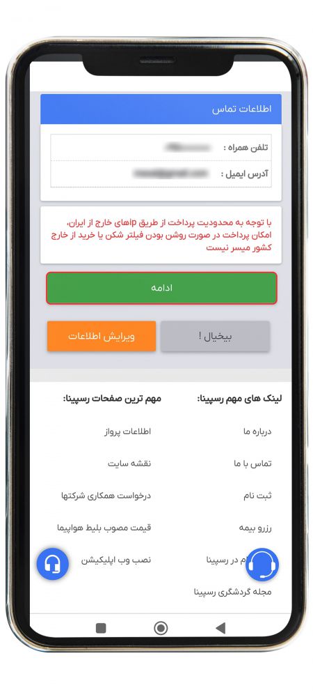 در آخر باید شماره تماس و ایمیل خود را بررسی کرده و روی گزینه "ادامه" کلیک کنید. اگر اطلاعات شما، نیاز به ویرایش دارد می توانید با انتخاب گزینه "ویرایش" مجدد به مراحل قبل برگردید و اصلاحات موردنیاز خود را انجام دهید.