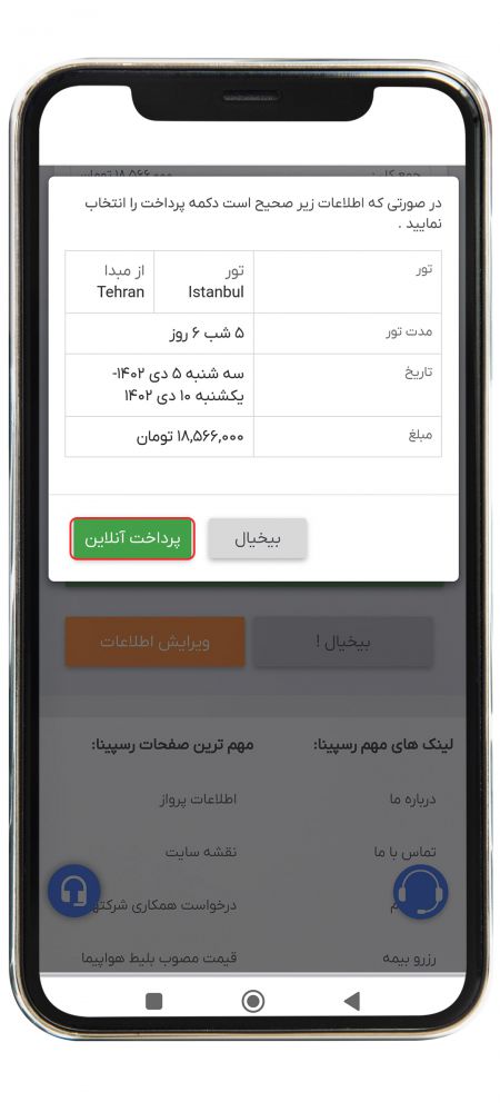 پس از کلیک بر گزینه ادامه، بار دیگر اطلاعات تور نمایش داده می شود که پس از بررسی آن، باید دکمه "پرداخت آنلاین" را انتخاب کنید.