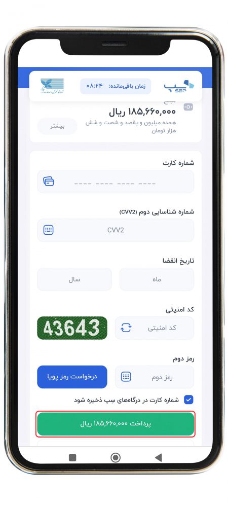 پس از ورود به درگاه پرداخت، اطلاعات کارت و رمز عبور خود را وارد کنید.