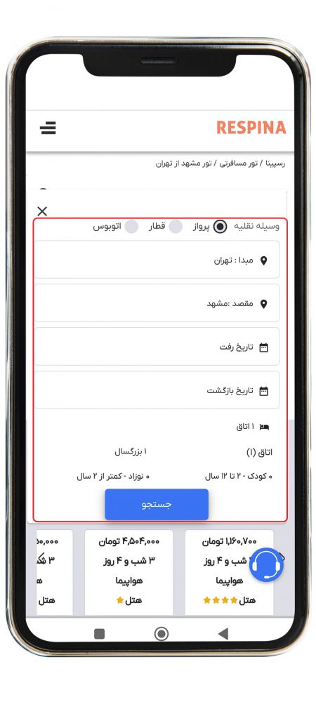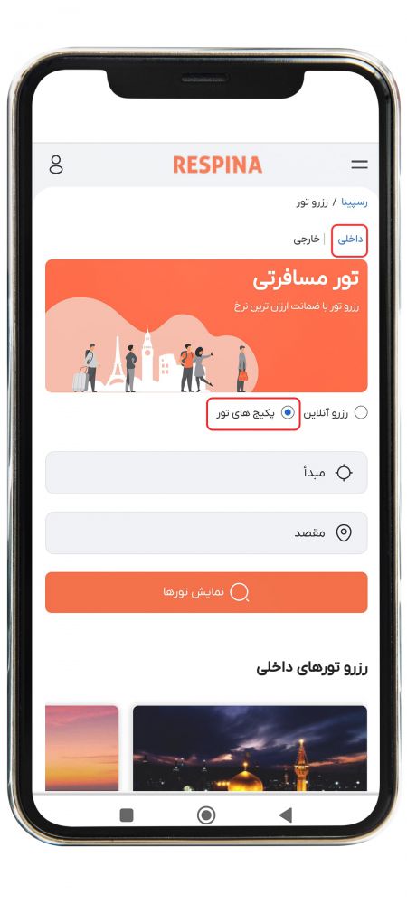 جهت رزرو تور داخلی و خارجی در رسپینا مراحل زیر را به ترتیب دنبال کنید و در صورت ایجاد هرگونه مشکل با پشتیبانی 24 ساعته رسپینا تماس بگیرید. اگر از طریق کامپیوتر وارد سایت می شوید، راهنمای دسکتاپ و اگر از طریق تلفن همراه خود قصد ورود به سایت را دارید، راهنمای موبایل را مطالعه کنید.