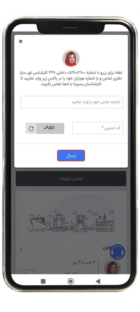 سپس در کادرهای مربوطه، شماره تماس و کد امنیتی را وارد کرده و روی گزینه "ارسال" کلیک کنید.