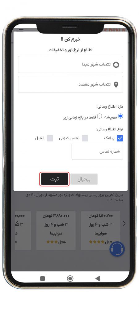 پس از کلیک روی آن و وارد کردن اطلاعات خواسته شده، کاهش نرخ تور و تخفیفات از طریق پیامک برای شما ارسال می شود. برای وارد کردن اطلاعات روی گزینه مربوط به آن کلیک کنید، سپس شماره تماس خود را وارد کنید و روی گزینه "ثبت" کلیک کنید.