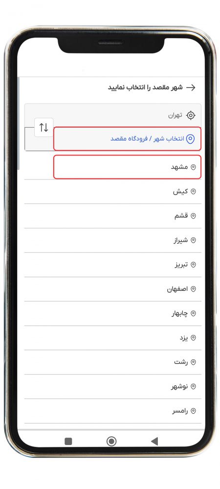 مقصد خود را هم به همین ترتیب تایپ کرده از بین گزینه های موجود آن را انتخاب کنید.